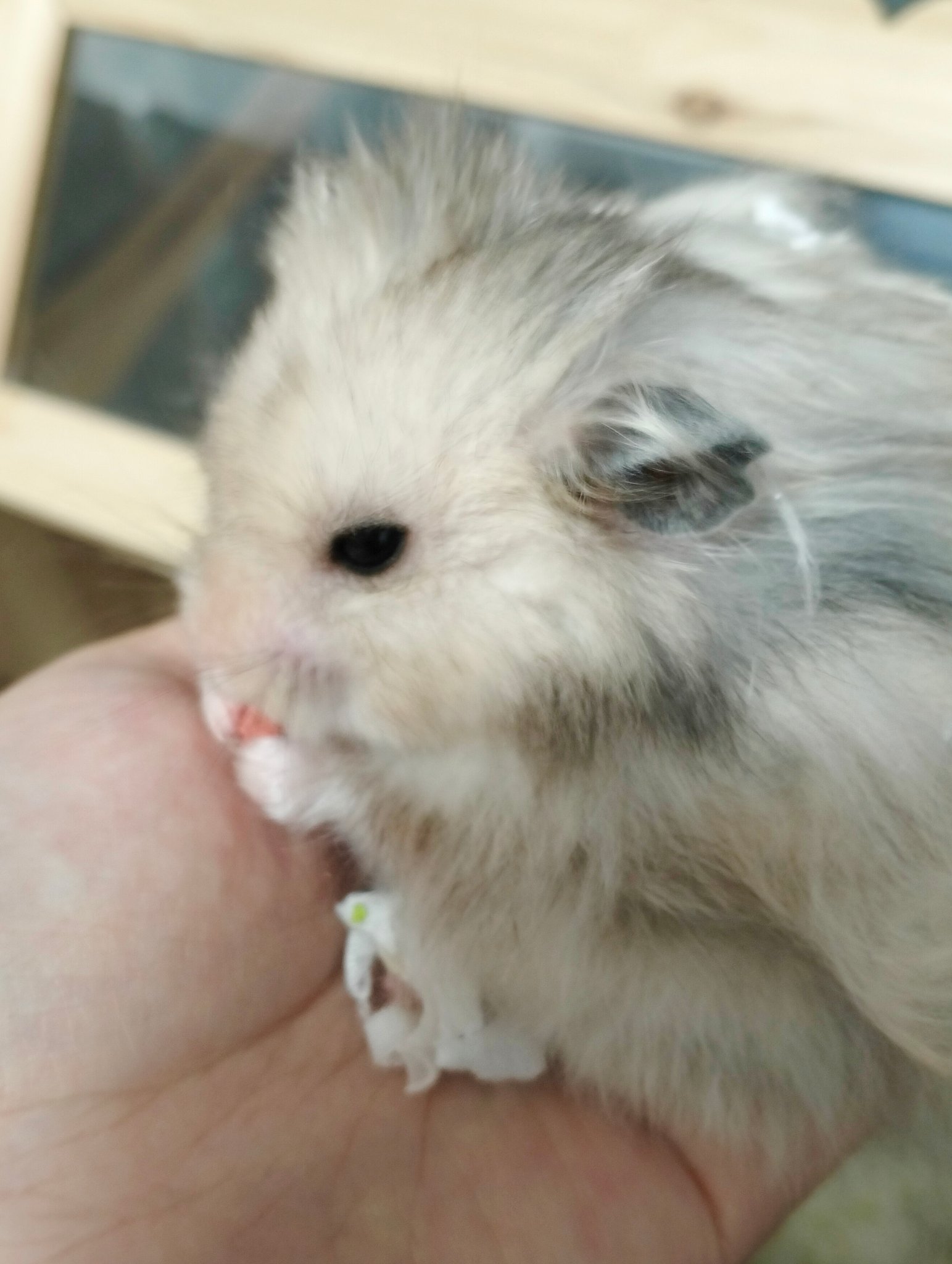 汤圆有自己的小个性。网上几乎所有仓鼠都能躺手吃东西,汤圆可以躺手,但东西是必须回窝才吃的。最近它才偶尔会在安静的环境下在我手上吃东西,我把这看作“亲近”的表现,擅自开心了一下。上手睡觉也是过了半年左右才能做到的,大概它的胆子比一般鼠要小。
