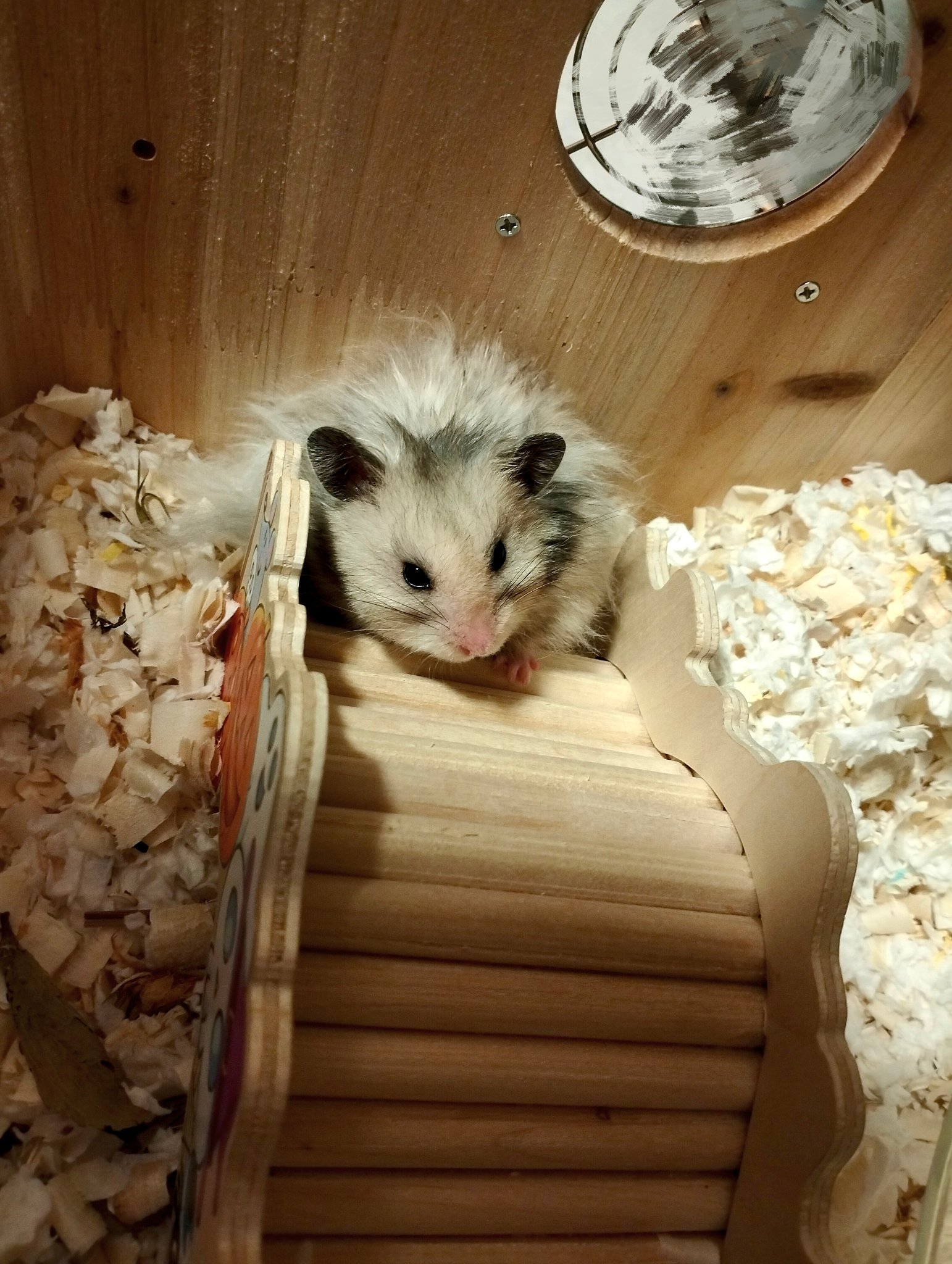 照顾它确实相当省心,或许也和它的性格有关:不怎么啃笼子,不暴躁,知道定点上厕所(金丝熊会,侏儒不会,这是我选金丝熊的原因)。我需要做的,就是定期添粮食和水,更换尿沙,每1-2周换一次垫料,冬季垫料铺厚,能一个月换一次。不需要洗澡和陪玩,仓鼠每天的活动量,都会在夜里自己跑跑轮完成。买了圈数计数器进行统计,它小时候每天能跑10公里,相当厉害,只是随着年龄的增长,也越来越懒了。